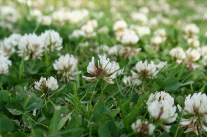 Clover is a nitrogen fixer, taking in nitrogen from the air through its leaves and fixing it in the soil via nodules on its roots.