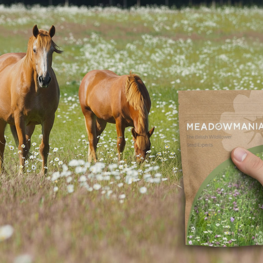 Add our specially blended mixes of horse-friendly wildflowers and perennial forage herbs to your horse paddock to improve the grazing palatability, supplement your horse's diet, and benefit their general health and well-being.