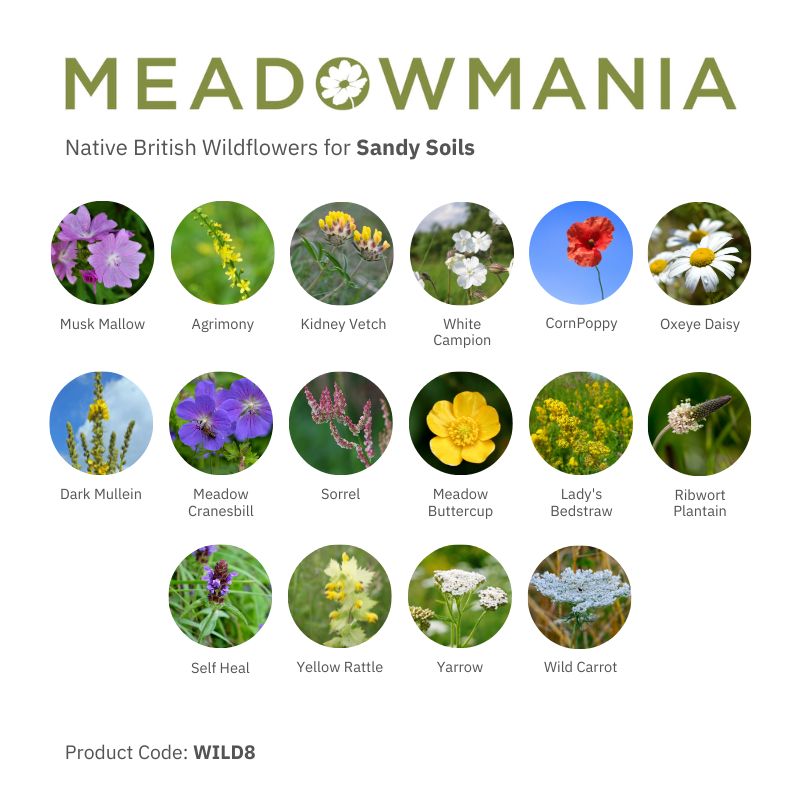 Our new mix of 16 British wildflower species which thrive in lighter sandy soils contains native perennials such as meadow cranesbill and white campion alongside annuals such as corn poppy.